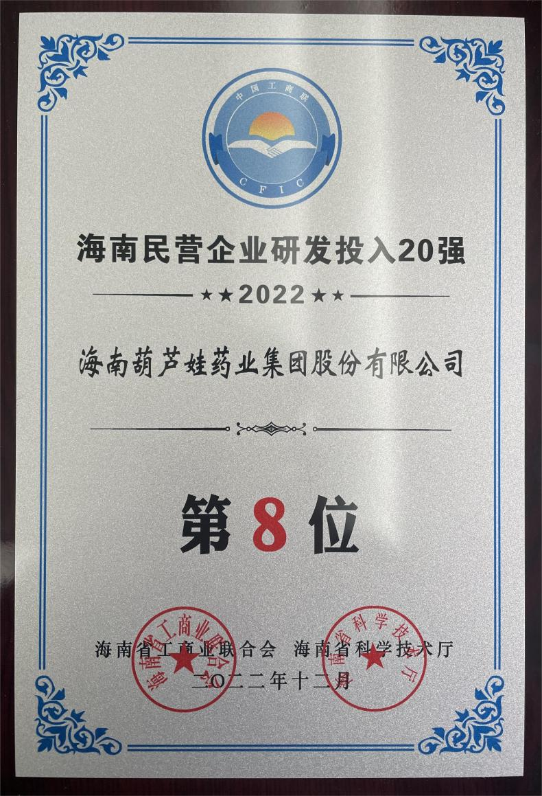 12月23日,2022海南民营企业50强和研发投入20强发布会在海口举行。会上发布了“2022海南民营企业50强”“2022海南民营企业研发投入20强”榜单和分析报告。天美娱乐药业再次荣登两榜,在海南民营企业50强榜单中位列第25位,较去年上升8位,这也是公司连续三年登榜;在海南民营企业研发投入20强中位列第8位,较去年上升7位。